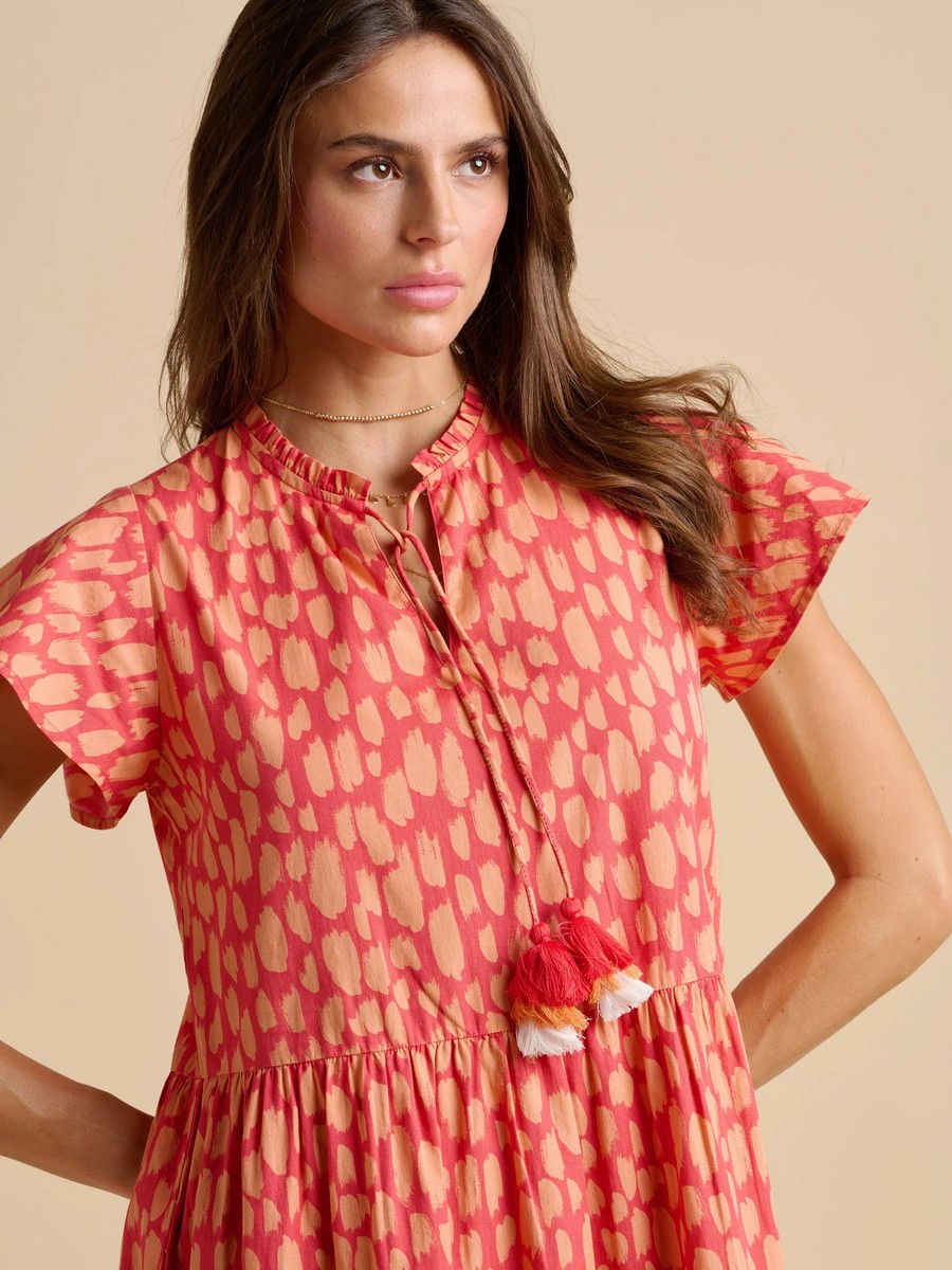Capture the warm hues of a sunset wherever you are, with this dress. The frill accents and tasselled neck ties add subtle details to this dreamy dress while hidden pockets up the practicality. There’s no better choice for sunset dates or evening strolls along the beach.