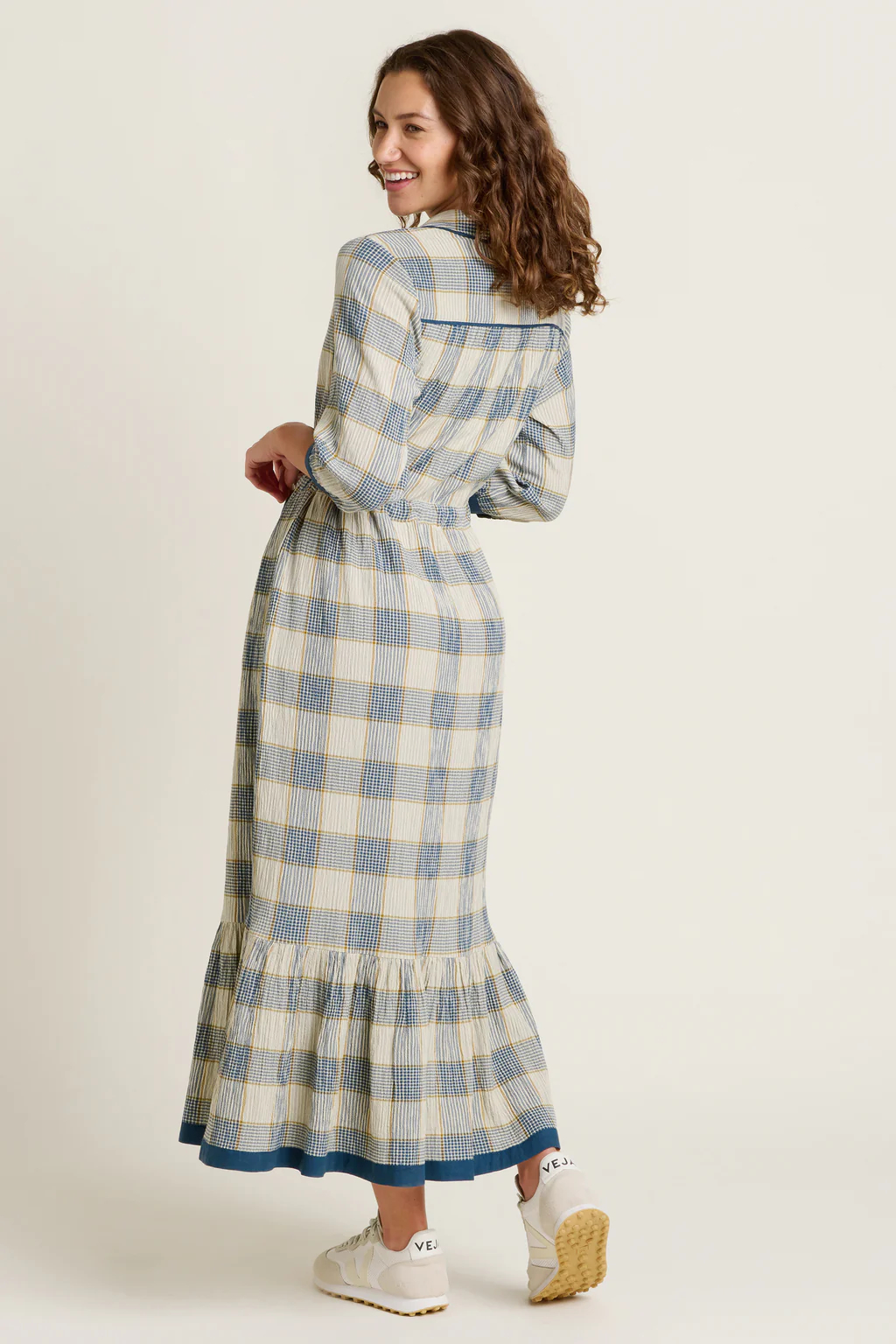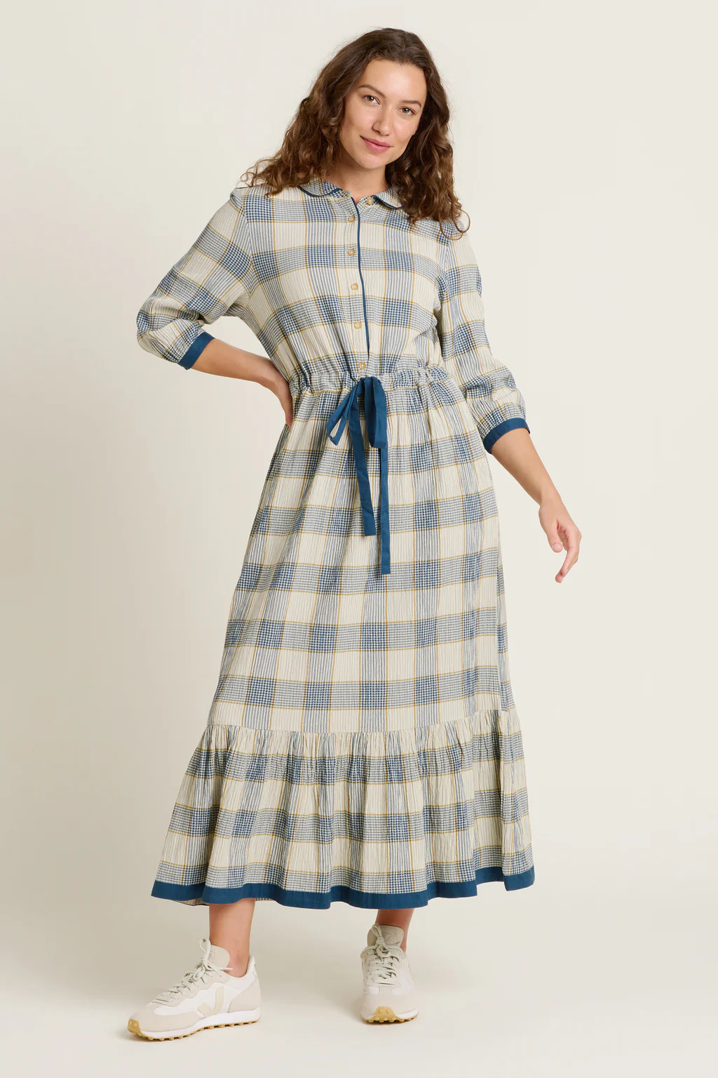 Dream of cosy cabins in the forest or a bothy by the sea with the Brakeburn Highcliffe Shirt Dress. It’s a casual maxi dress, made from navy, cream and olive check crinkle fabric. Features include a Peter Pan collar, pops of navy piping, ruffle hem, three quarter sleeves. There’s a drawstring and pockets at the waist too. Wear with boots, layer with a knitted vest or button-up cardigan this season.