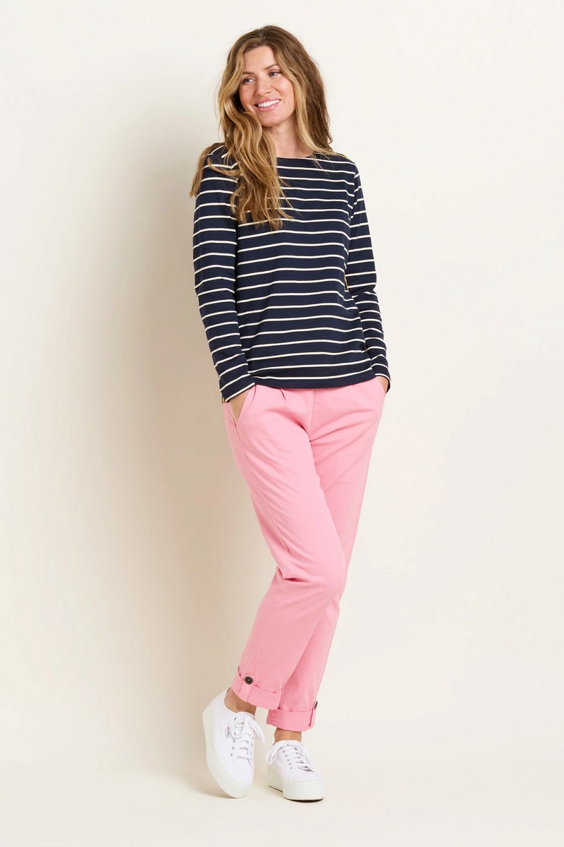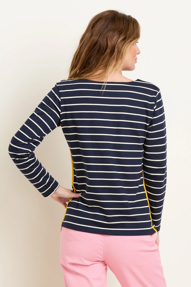 Classic navy and white stripe with highlights of mustard. Regular fit, with button details on the shoulder and herringbone side stripes. Ideal for spring and summer, on the water or on dry land.