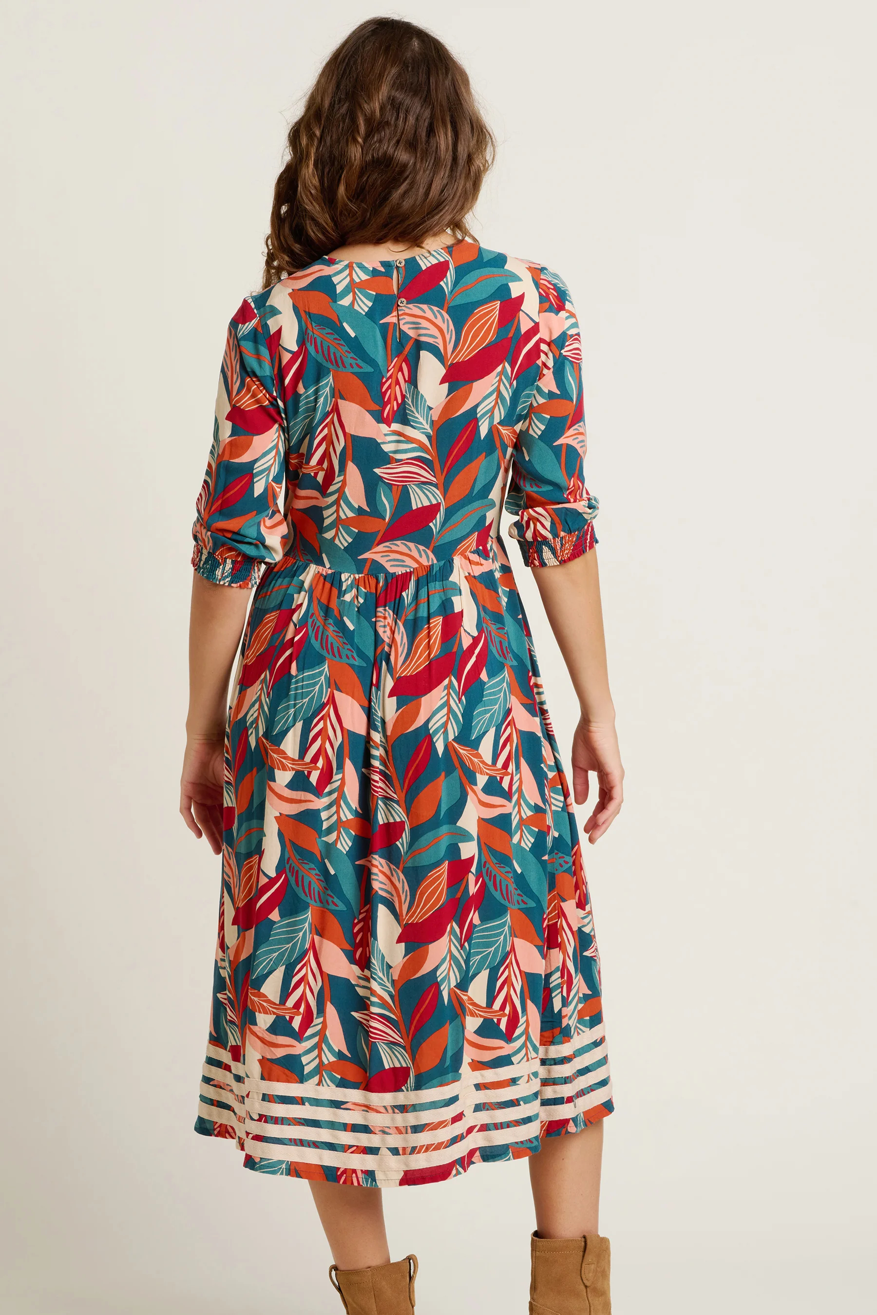 If you’re seeking bold colours and botanical patterns this season, you’ll love the Evergreen Midi Dress. It’s a casual day dress for laidback living. Floaty fitting, three quarter sleeves with shirring at the cuffs, not to mention gathering and pockets at the waist. Ideal for autumn breaks abroad or transitional seasons closer to home.