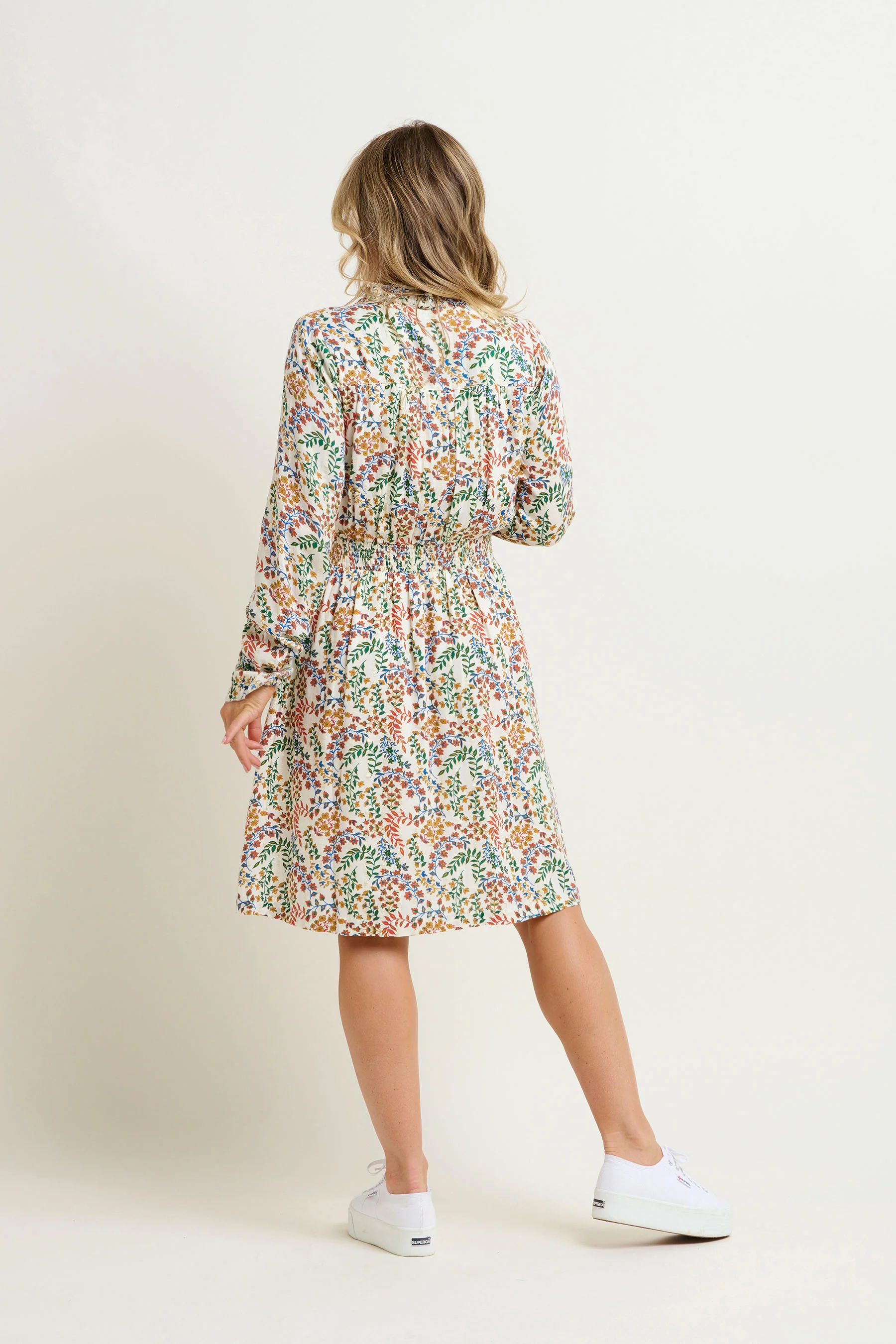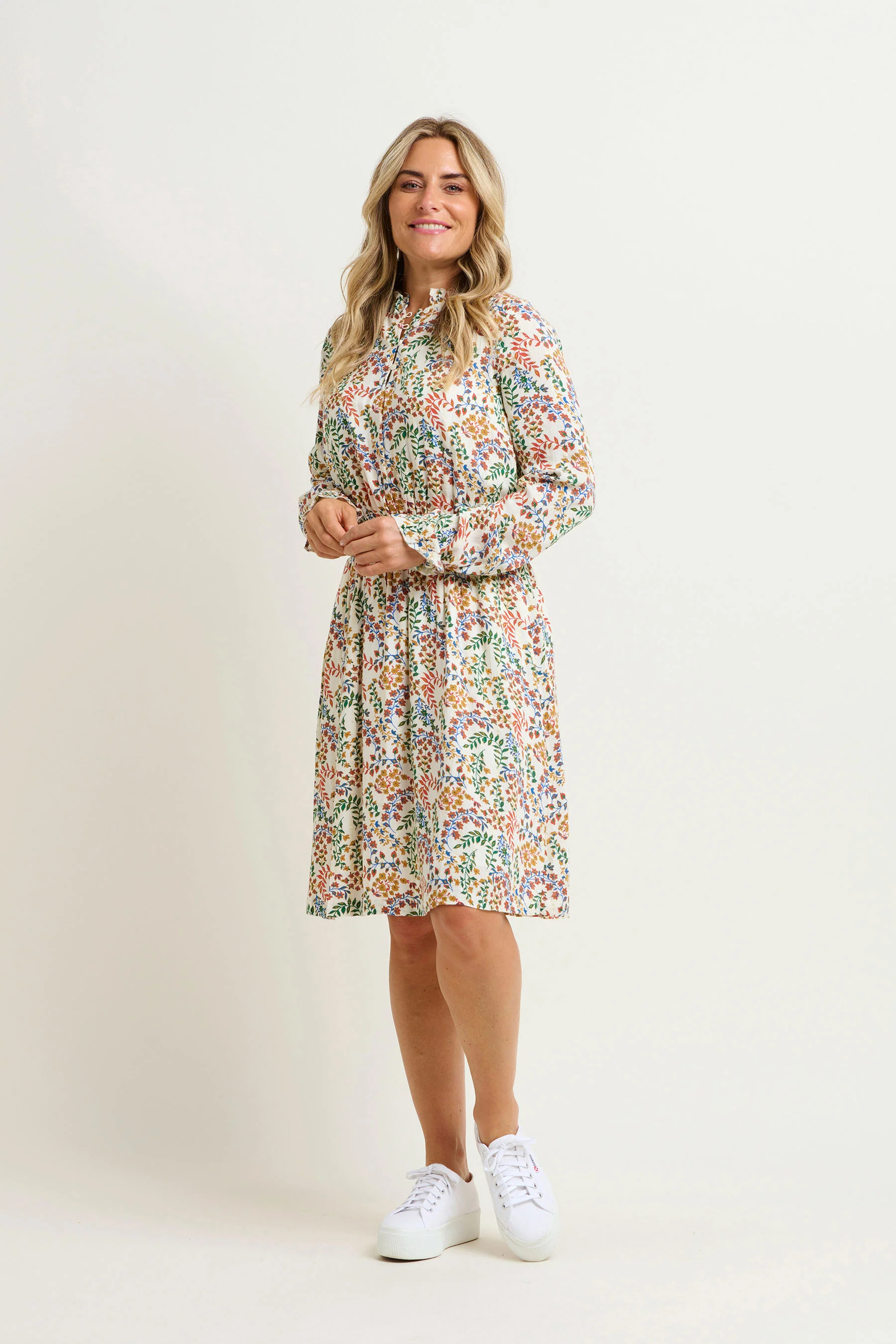 This paisley print dress is made from crinkle crepe fabric with metallic gold spots adding a touch of elegance. Fully lined for added comfort, it features a ruffle collar and notch neck with ties adorned with decorative beads for a hint of added flair. The three-quarter length sleeves have shirred cuffs, and it falls to a flattering mid length. It also has pockets.