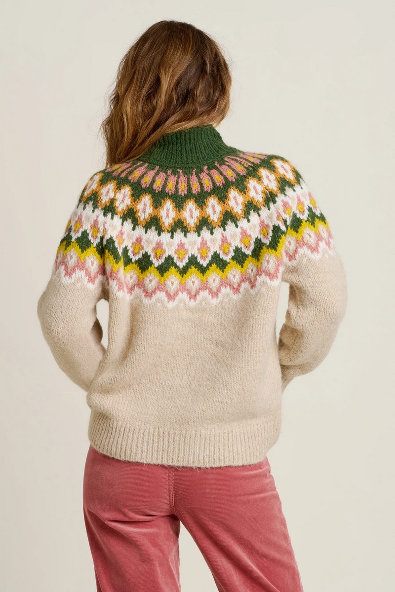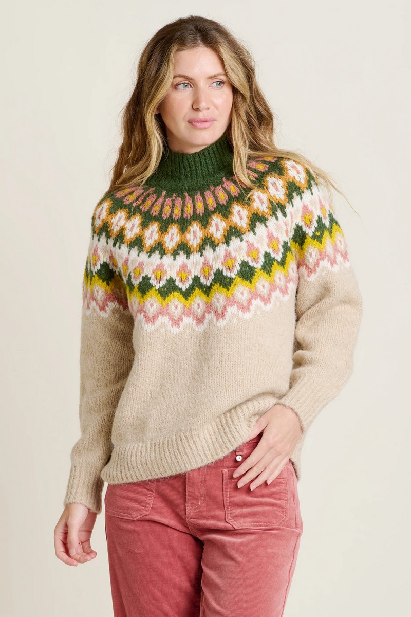 Welcome the warmth of a chunky knitted Fair Isle sweater this season. Made in earthy tones of soft, recycled acrylic yarn, with a bold Fair Isle pattern around the yoke, this is a winter jumper designed for layering. Wear with jeans and your favourite boots under a parker jacket.