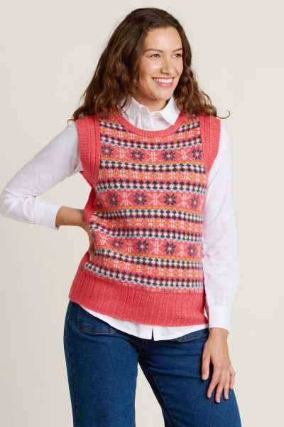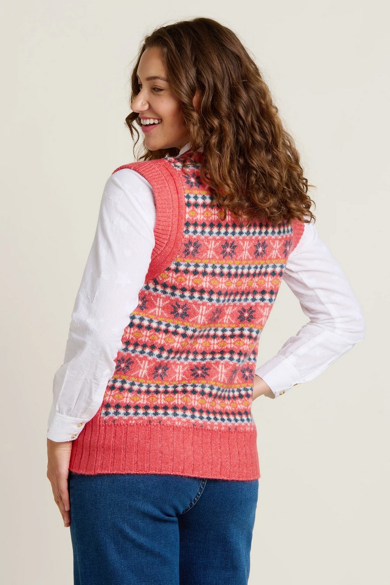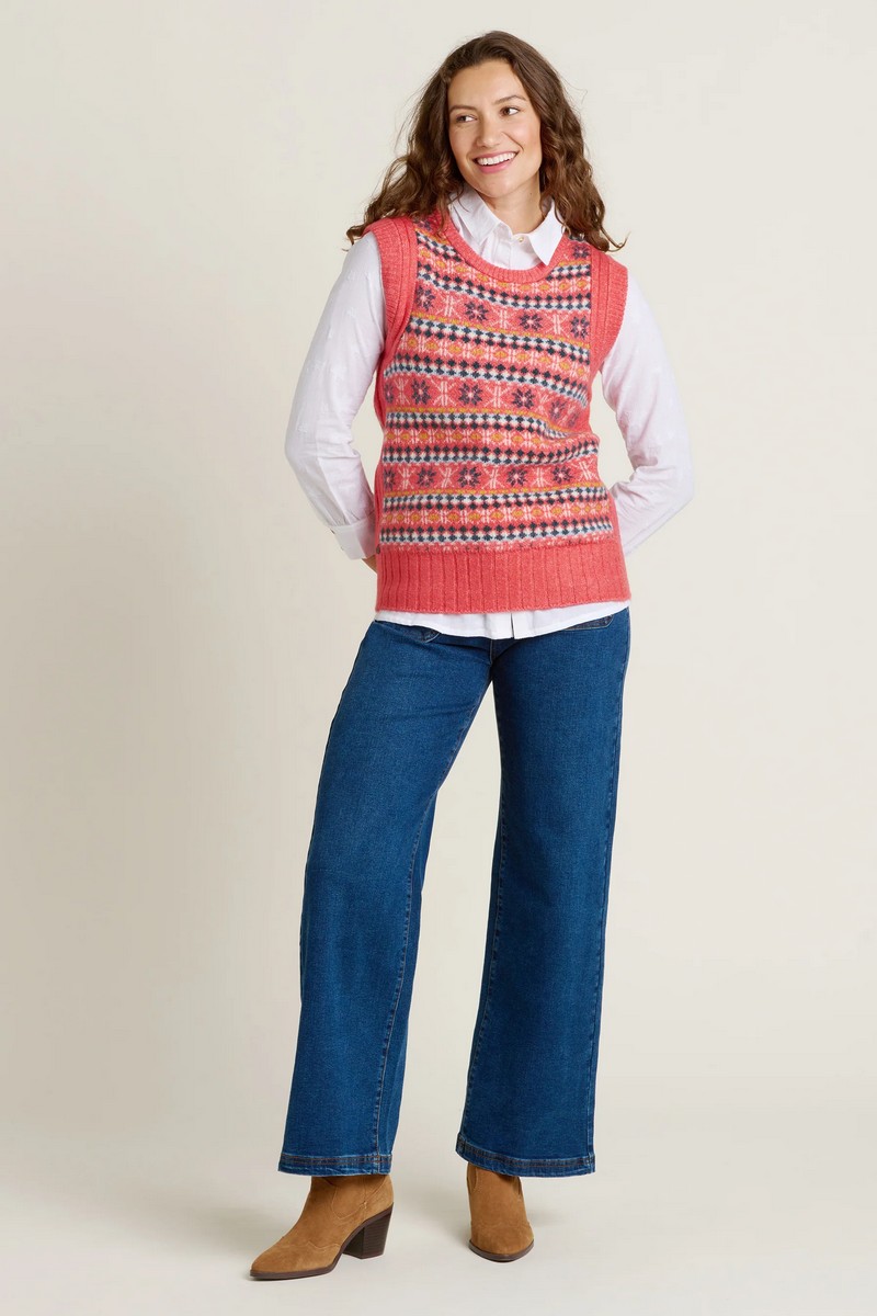 Bring colour and pattern into your winter wardrobe with the Pink Fair Isle Knitted Vest by Brakeburn. A soft yet dense knit made with recycled acrylic, the bold Fair Isle pattern is fun, a little festive, but still incredibly versatile. Wear layered over a blouse with jeans or skirt and boots.