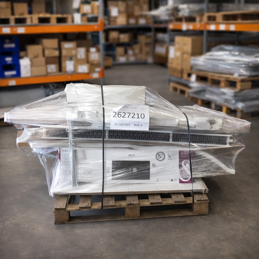This pallet contains a mixed selection of returned bathroom fixtures, heating products, flooring and building materials.
