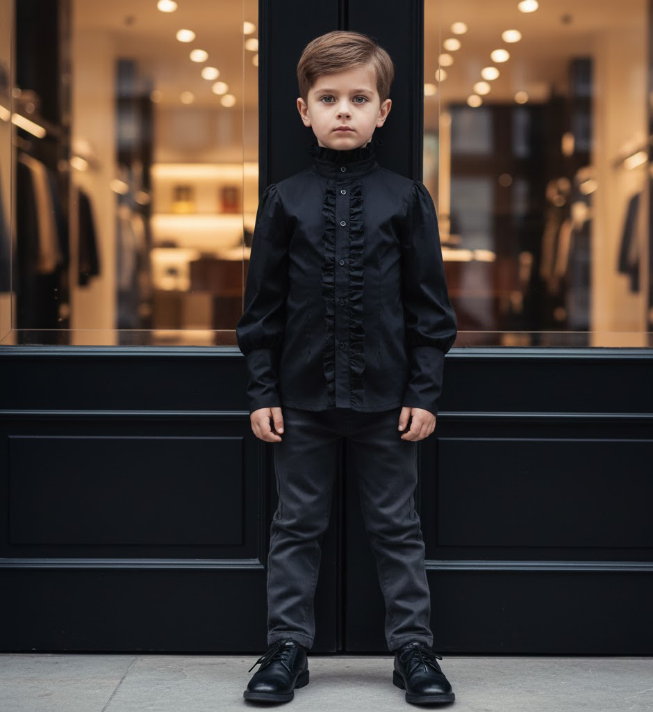 Give your young gentleman timeless flair with this elegant Boys Black Cotton Shirt, designed in a charming vintage prince style. With its classic button-down front, structured collar, and soft cotton fabric, this long sleeve top is perfect for parties, weddings, stage performances, school events, or even stylish everyday wear.