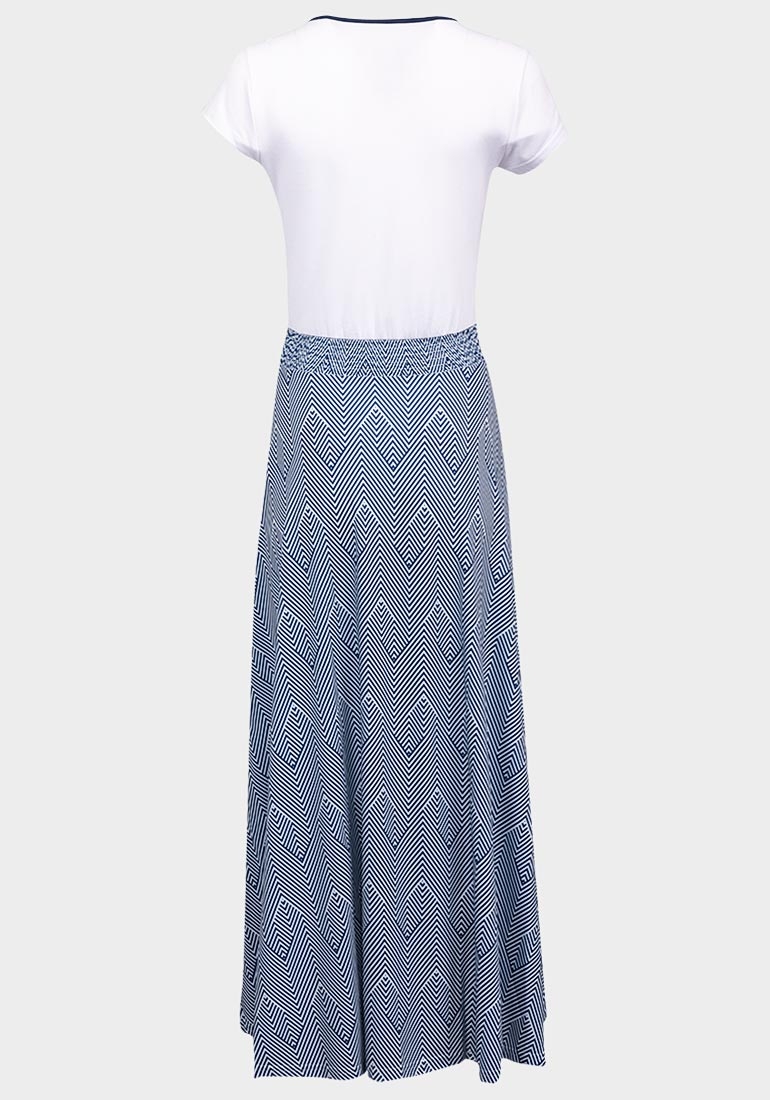Maxi length dress with jersey top, one piece with the appearance of a two piece garment