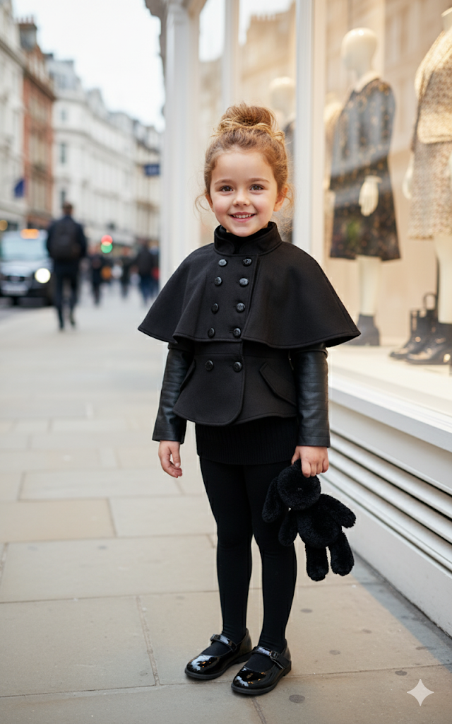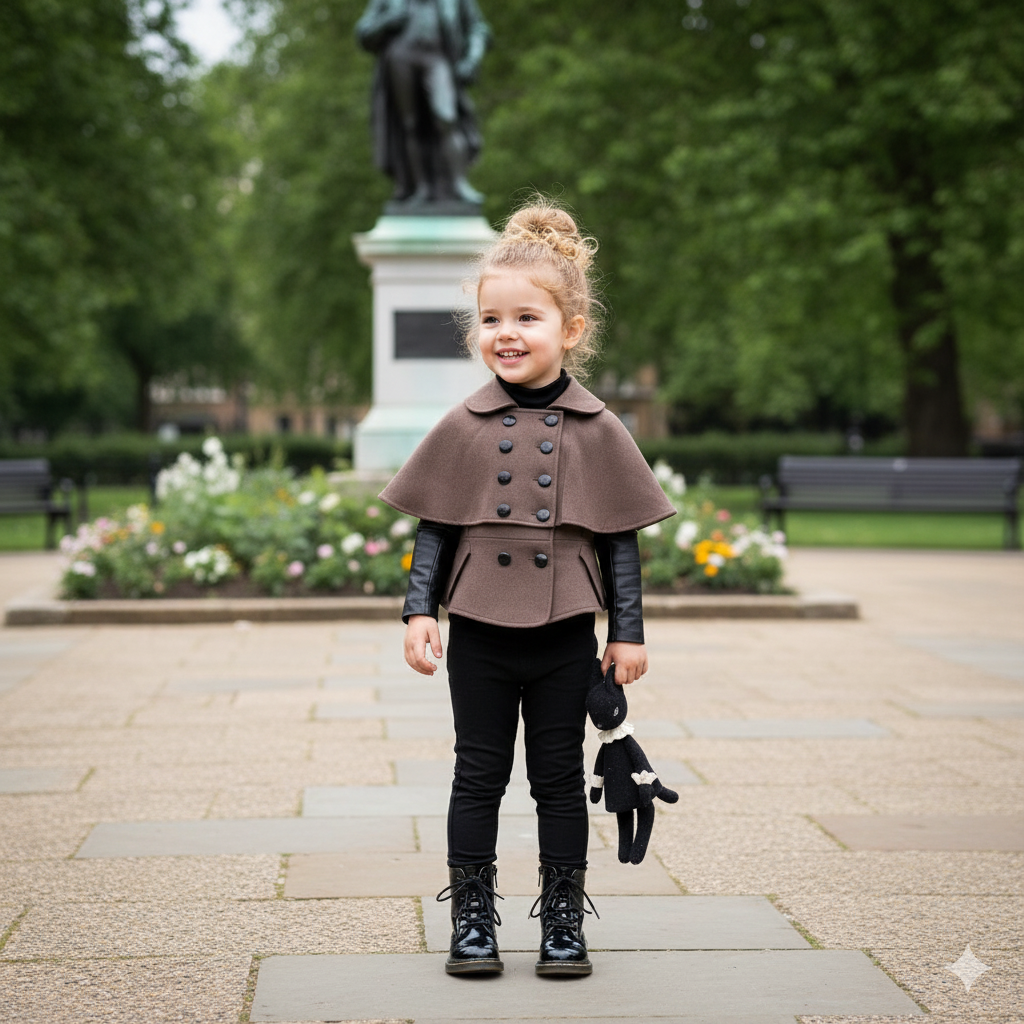 dd charm and elegance to your little one’s wardrobe with this beautiful vintage-inspired cape coat. Designed with a soft A-line baby doll silhouette and graceful cape structure, it creates a timeless princess look while remaining comfortable for everyday wear. Crafted from a soft wool-blend fabric and fully lined inside, this coat keeps your child warm while allowing free movement during autumn and winter days. The elegant design makes it perfect for both everyday outfits and special occasions. ✨ Product Features • Soft wool-blend fabric for warmth and comfort • Elegant cape-style silhouette with vintage charm • Classic princess-style design • Fully lined interior for added comfort • Easy front closure for quick dressing
