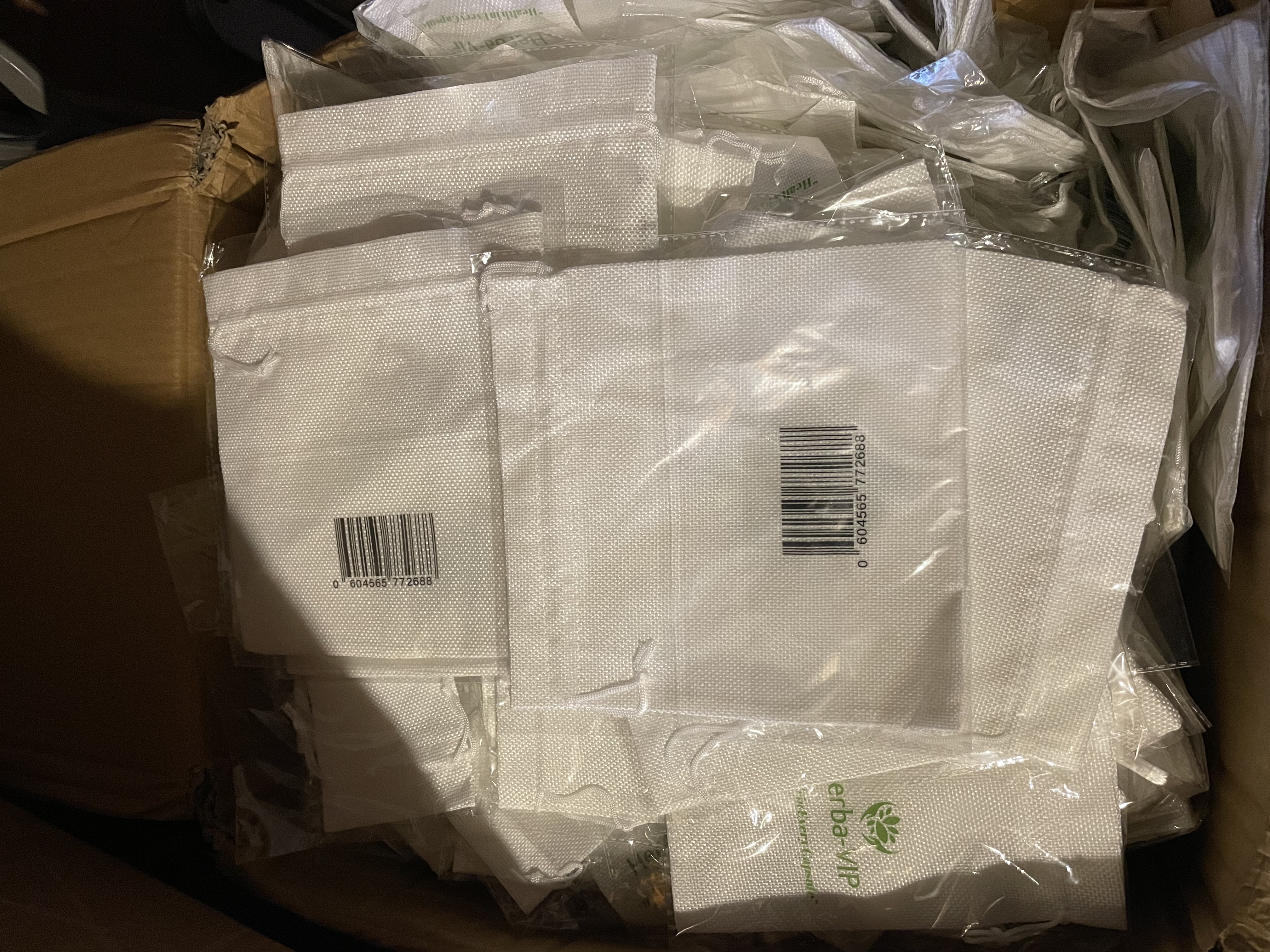 Eco-friendly, brand new, branded burlap bags made of linen, perfect for jewellery, food, and gift packaging. White colour, size 20x20 cm, 100 pcs per order.