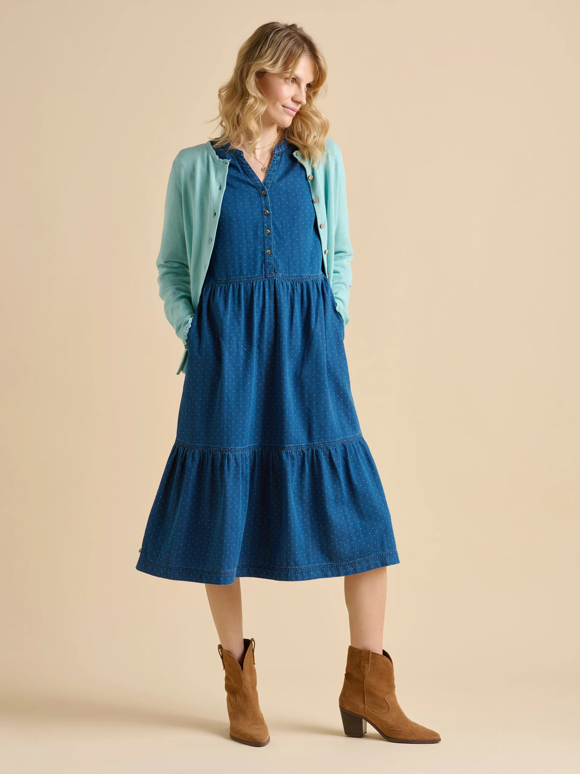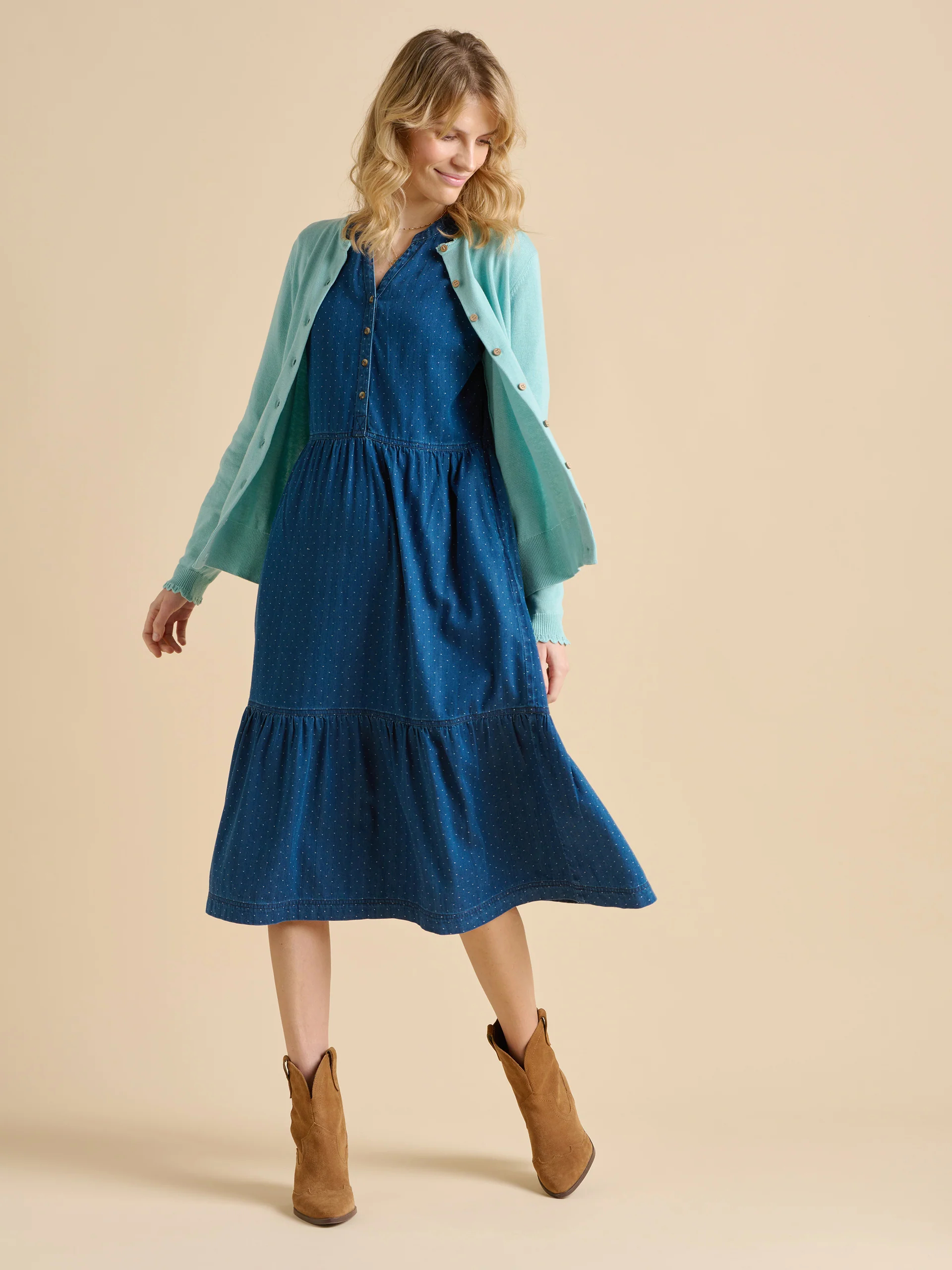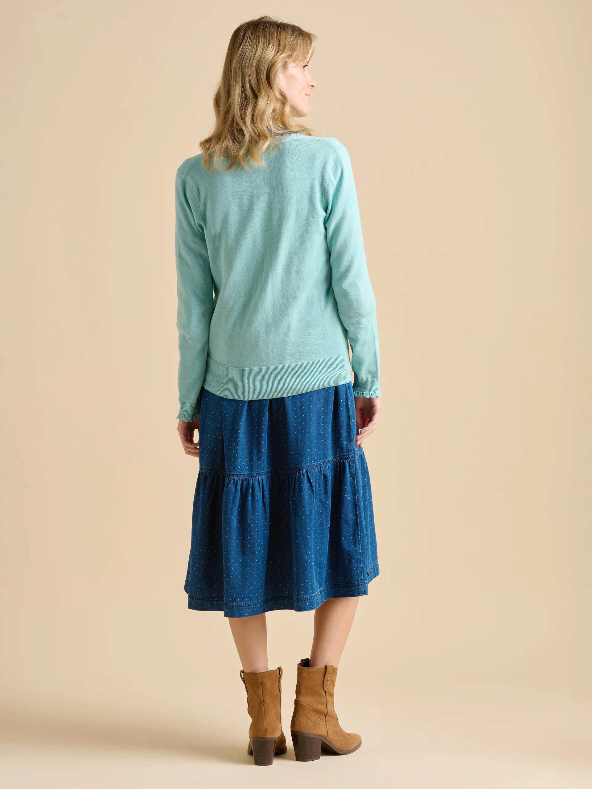 This sea blue cardigan brings a refreshing, airy feel to your wardrobe. The lightweight knit and wooden buttons keep it simple yet stylish, while the knitted trim on the collar and cuffs adds a subtle touch of texture. Pair with white cut-off jeans and chunky pumps.