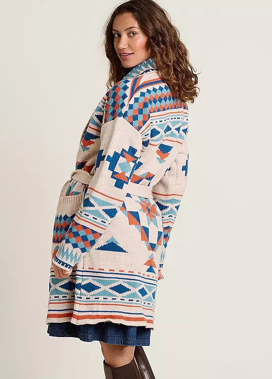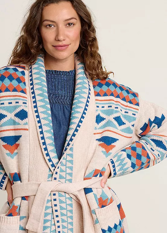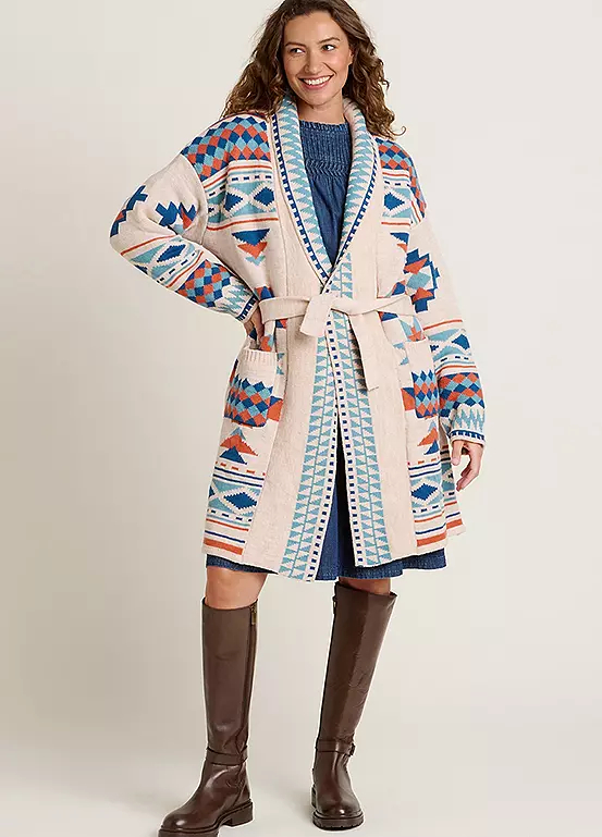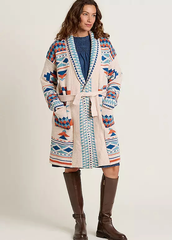 Bring vintage vibes into modern day with this Geo Belted Knitted Cardigan. Bold, striking with big deep pockets, a tie waist and shawl collar, this patterned Belted Knitted Cardigan is casual, laidback and fun. Wear with skinny jeans or flared trousers and a long-sleeve tee.