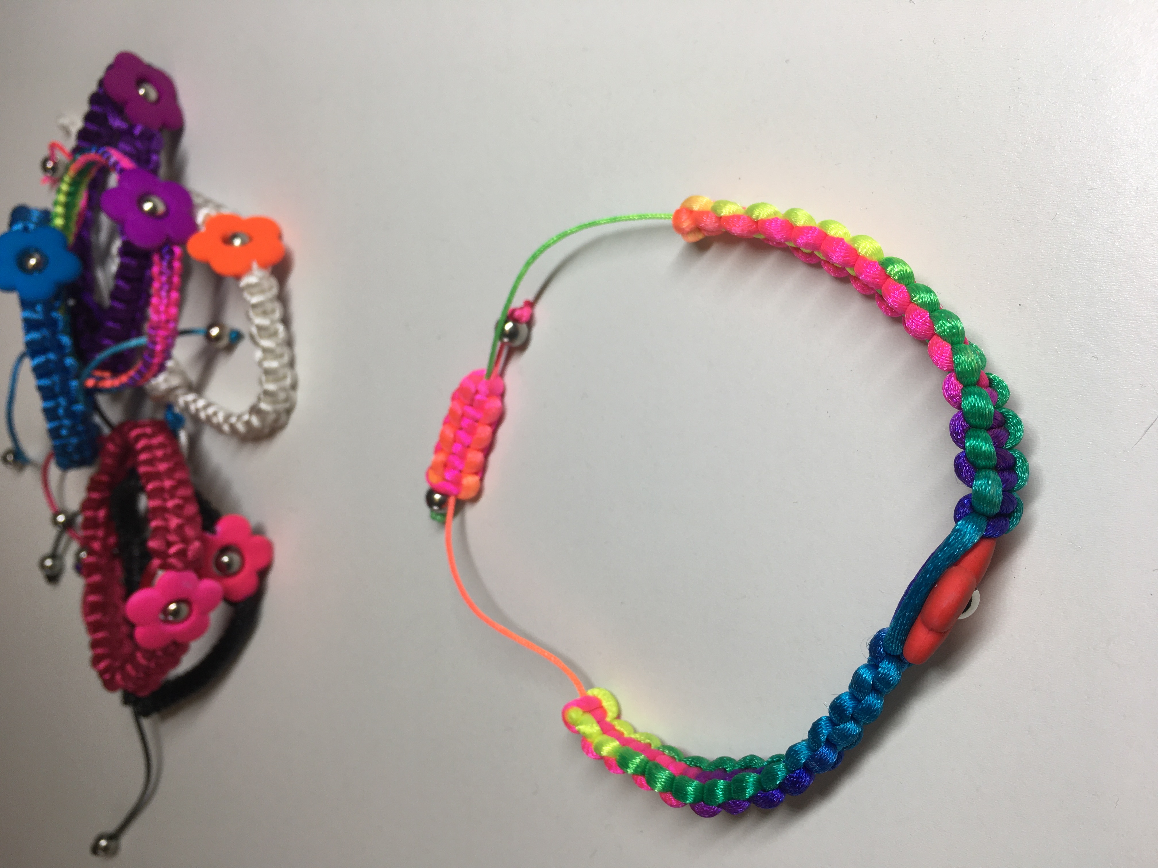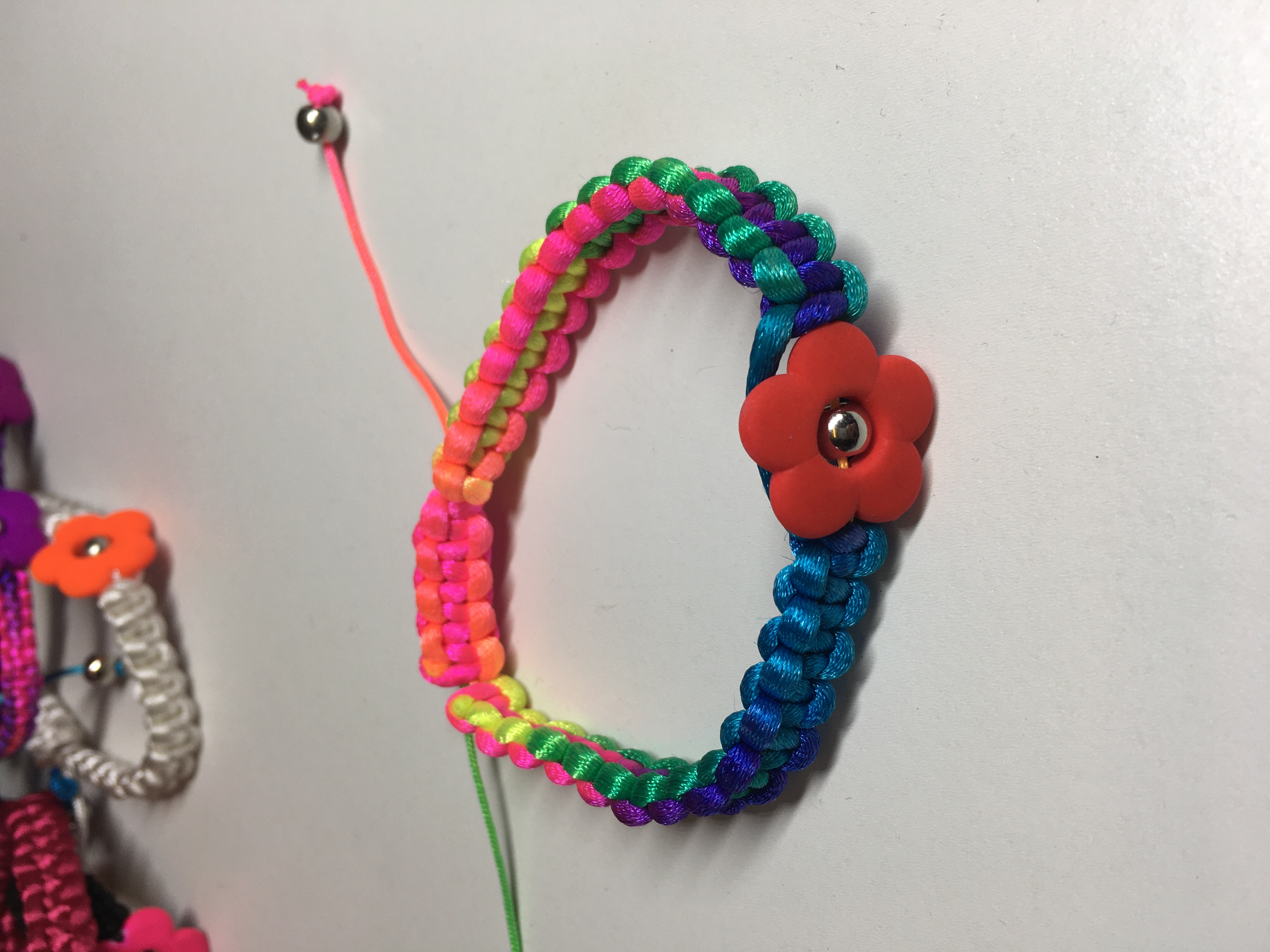 The flower bracelets feature a resin flower with a silver bead centre. The main body of the bracelet is braided nylon and can be adjusted to fit. They will come in a variety of vibrant colour variations.