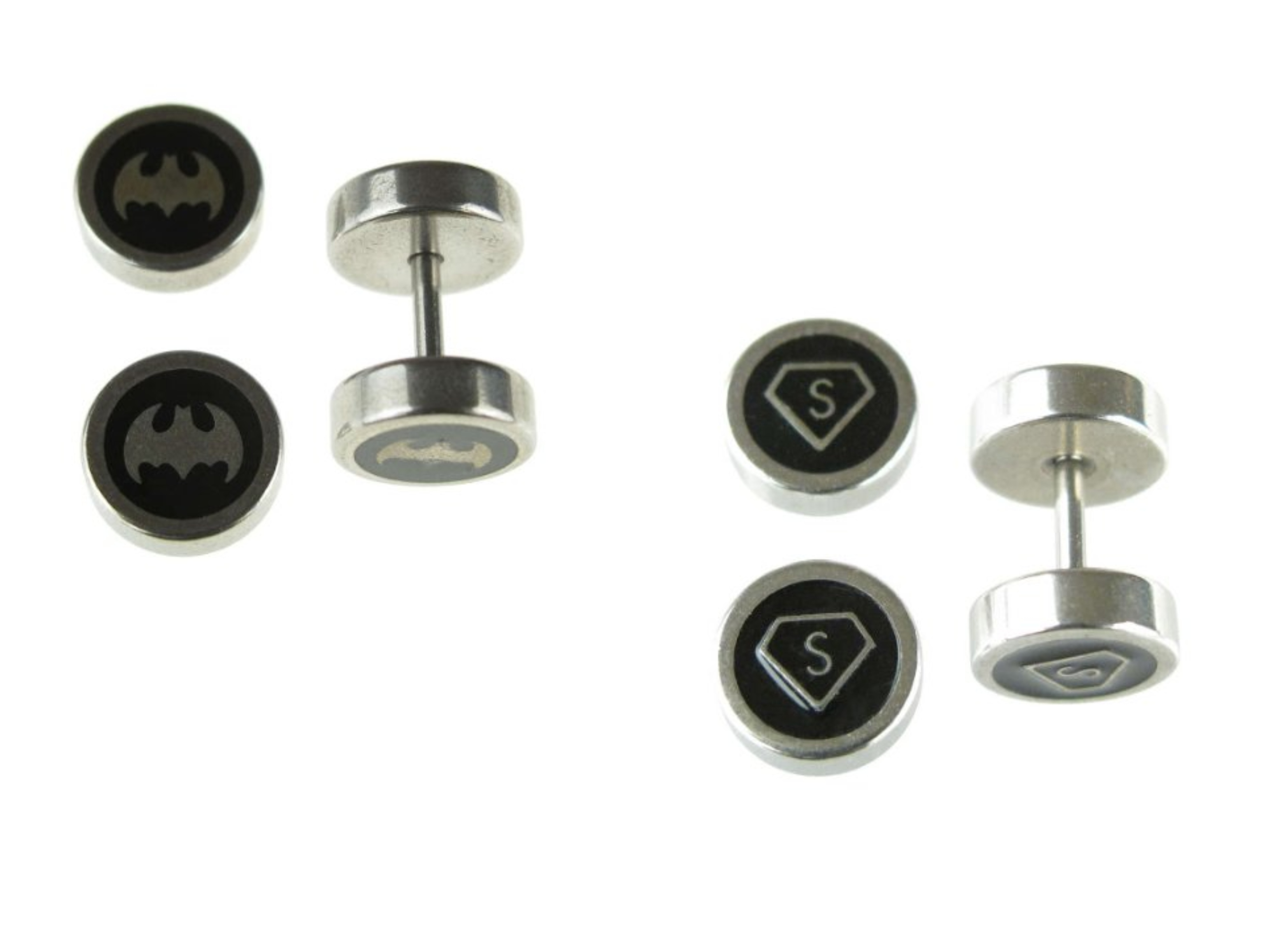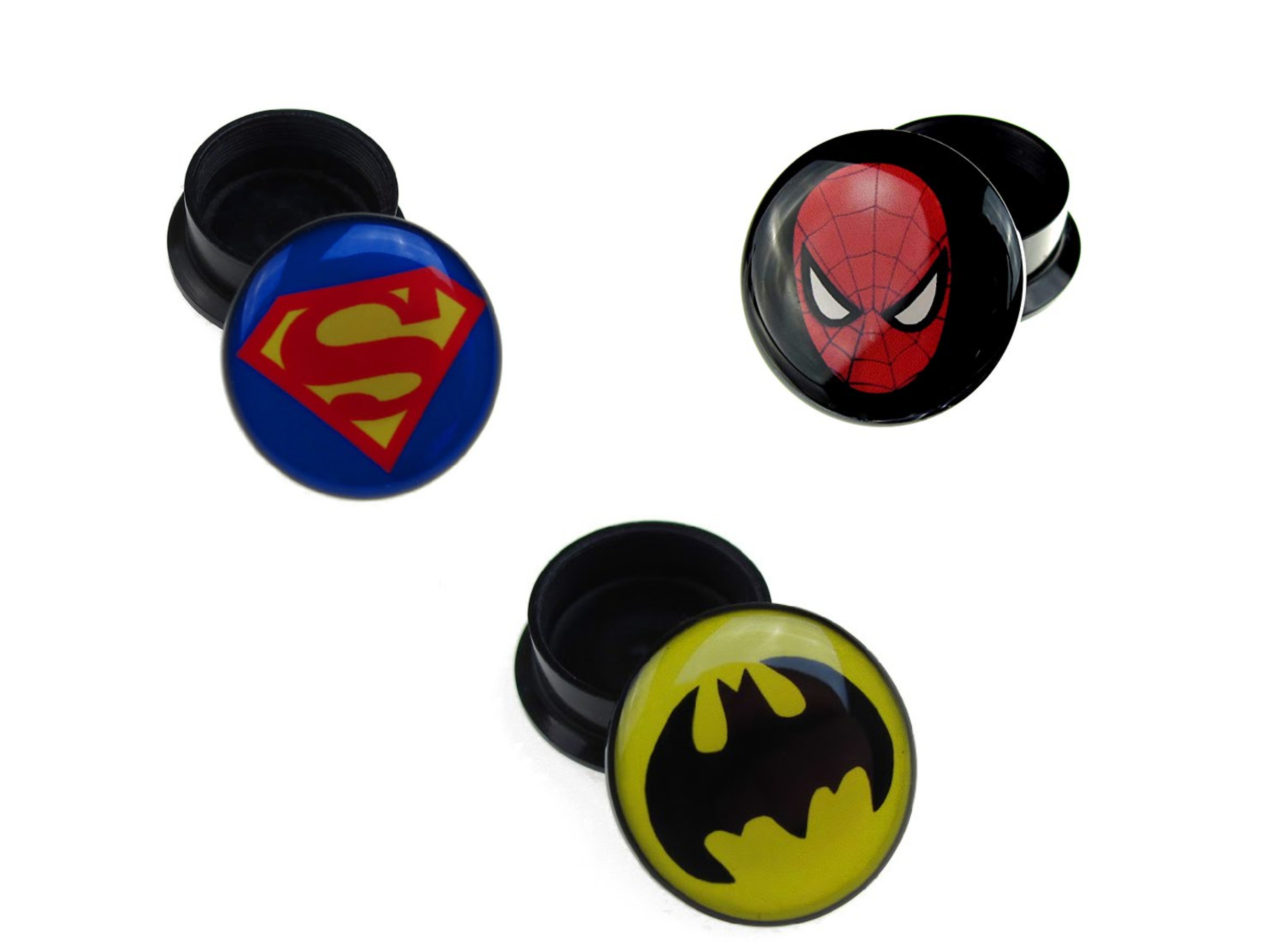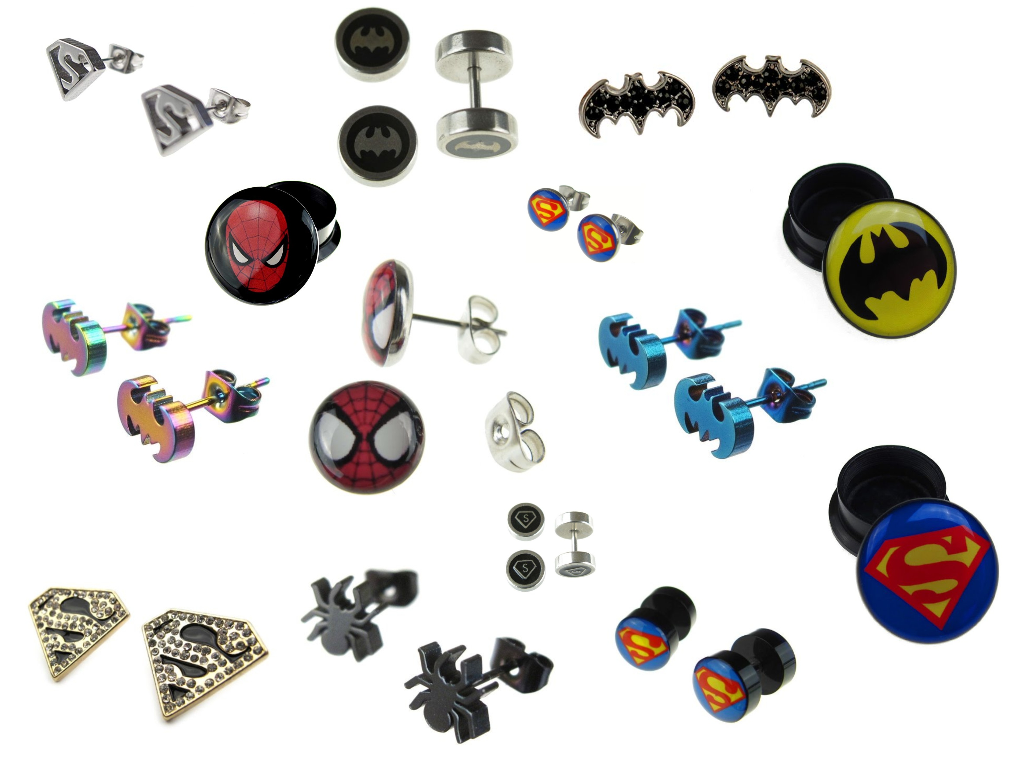 You will receive 100 individual superhero earring and plugs inspired by the superheros Batman, Spiderman and Superman.
